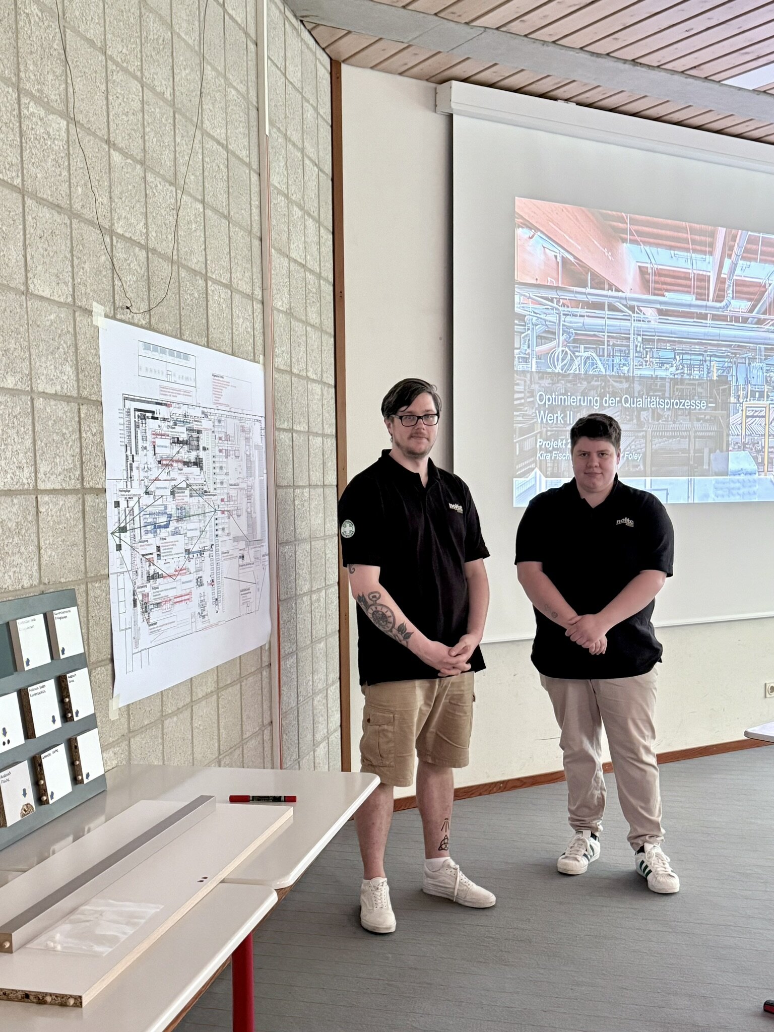 Auch die zweite Projektphase der Teilzeit-Oberstufe ist nun geschafft! In Zusammenarbeit mit den Firmen wurden spannende Projekte erarbeitet. Dabei tragen die Projektarbeiten so wundervolle Titel wie „Analyse der Abweichung manueller Messmethoden zur Erfassung der Planheitsabweichungen von Spanplatten“ (Egger Holzwerkstoffe), „Einführung von beidseitigem Korpusmaterial für den Wandeck- und den Untereckschrankbereich“ (nobilia-Werke) oder „Integration der neuen Kantenanleimmaschine mit digitaler Einbindung und optimiertem Materialfluss“ (Schröder Küchen). Es geht aber auch einfacher mit „Optimierung der Qualitätsprozesse im Werk 2“ (Nolte Küchen) und „Neuanschaffung einer Abbundanlage“ (Atelier für Holzbau C. Schormann). Da kann man schon beim Lesen der Titel erahnen, wie viel Arbeit in den Projekten steckt. Wir haben wieder viel dazugelernt!